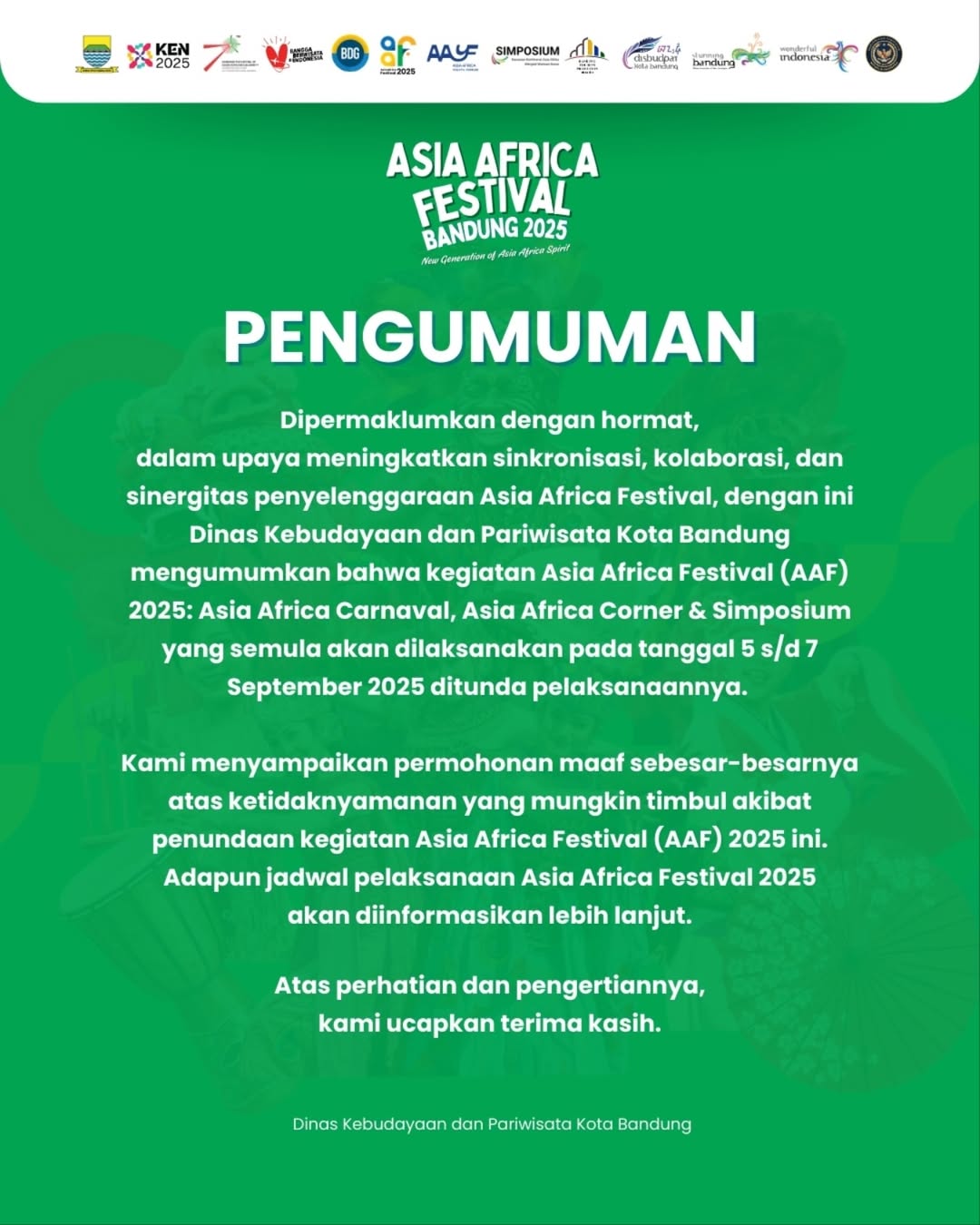 “Kami menyampaikan permohonan maaf sebesar-besarnya atas ketidaknyamanan yang mungkin timbul akibat penundaan kegiatan Asia Africa Festival (AAF) 2025 ini,” ujar Kepala Dinas Kebudayaan dan Pariwisata Kota Bandung, Rabu 3 September 2025.