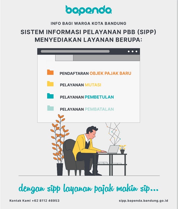 Melalui portal sistem informasi pelayanan PBB (SIPP), warga Kota Bandung kini dapat menikmati berbagai kemudahan pelayanan PBB tanpa harus datang ke Kantor Disyanjak.