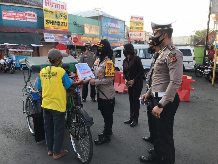BANJAR – Berlokasi di Simpang 4 Makin dan Pasar Kota Banjar, Kapolres Banjar Polda Jabar AKBP Melda Yanny, S.I.K.,M.H. pimpin personil Satuan Lalu Lintas Polres Banjar Polda Jabar sosialisasi dan beri himbauan kepada pengguna jalan, serta berikan apresiasi berupa hadiah kepada pengendara yang patuh dan taat terhadap peraturan lalu lintas dan patuh terhadap protokol kesehatan, Senin (3/8/2020).